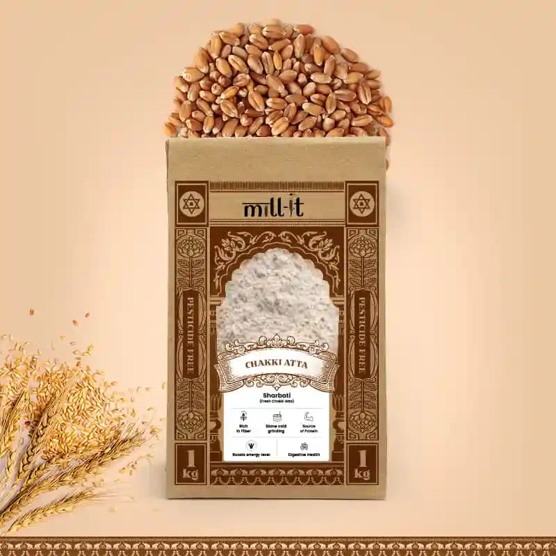 Experience the purity of Mill-it Sharbati whole wheat chakki atta , freshly milled in our own hygienic unit, via stone cold grinding and is rigorously tested to be pesticide-free. Ideal for soft, fluffy rotis, it's packed with essential macro and micronutrients for a nourishing meal experience.